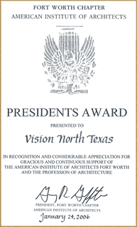 Vision North Texas was an award winning partnership of private, public, and academic organizations making an important contribution to the future quality of life, economic desirability and long-term sustainability of the 16-county North Central Texas region. It increased public awareness about important regional land use issues that affect mobility, air quality, water supply and other economic and environmental resources.