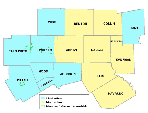 In 2003, the North Central Texas Council of Governments facilitated the purchase of digital orthophotography (orthos) for all 16 counties in North Central Texas. The orthos were collected at 6-inch resolution for Collin, Dallas, Denton, Ellis, Kaufman, Navarro, Rockwall, and Tarrant counties and 1-foot resolution for the remaining counties.