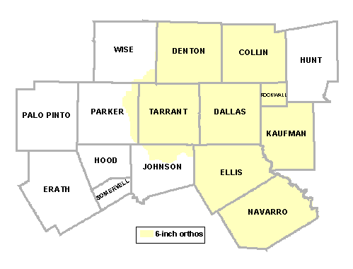 In 2005, the North Central Texas Council of Governments facilitated the purchase of 6-inch digital orthophotography (orthos) for the following eight counties in North Central Texas: Collin, Dallas, Denton, Ellis, Kaufman, Navarro, Rockwall and Tarrant.