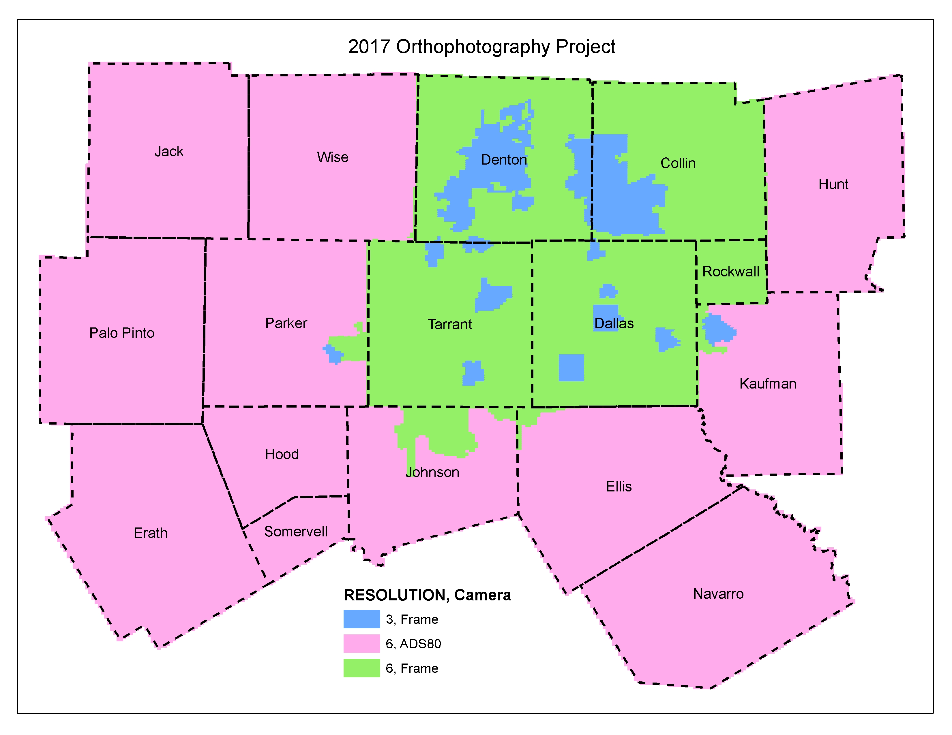In 2017, the North Central Texas Council of Governments facilitated the cooperative purchase of 4-band (NIR), 3-inch and 6-inch resolution digital aerial photography (orthos) for over 13,800 square miles of the NCTCOG region including all of Collin, Dallas, Denton, Tarrant and Rockwall, Hunt, Kaufman, Ellis, Johnson, Hood, Navarro, Parker, Palo Pinto, Somervell, Wise and Jack counties. The contractor for this project was Woolpert. The orthos were collected in January through March 2017 (leaf-off) and are available for purchase via DFWMaps Marketplace according to the following price schedule.