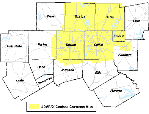In 2001, the North Central Texas Council of Governments facilitated the purchase of digital elevation contours for the following five counties in North Central Texas: Collin, Dallas, Denton, Rockwall and Tarrant. The contours were captured coincident with the 2001 digital aerial photography using light detection and ranging (LIDAR) and are available at two-foot intervals. The contractor for this project was Vargis, LLC.
