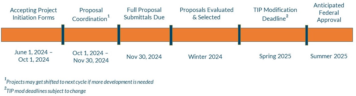 Due to the eligibility requirements for each of these funding sources, the projects considered must be with a local government, operator of public transportation, or a nonprofit organization. If you do not fit into one of these categories, you may still submit a project idea, but a partnership with an eligible entity will be necessary for project development and implementation if selected. The program is accepting project ideas on a rolling basis, and the evaluation cycles coincide directly with TIP modification deadlines.