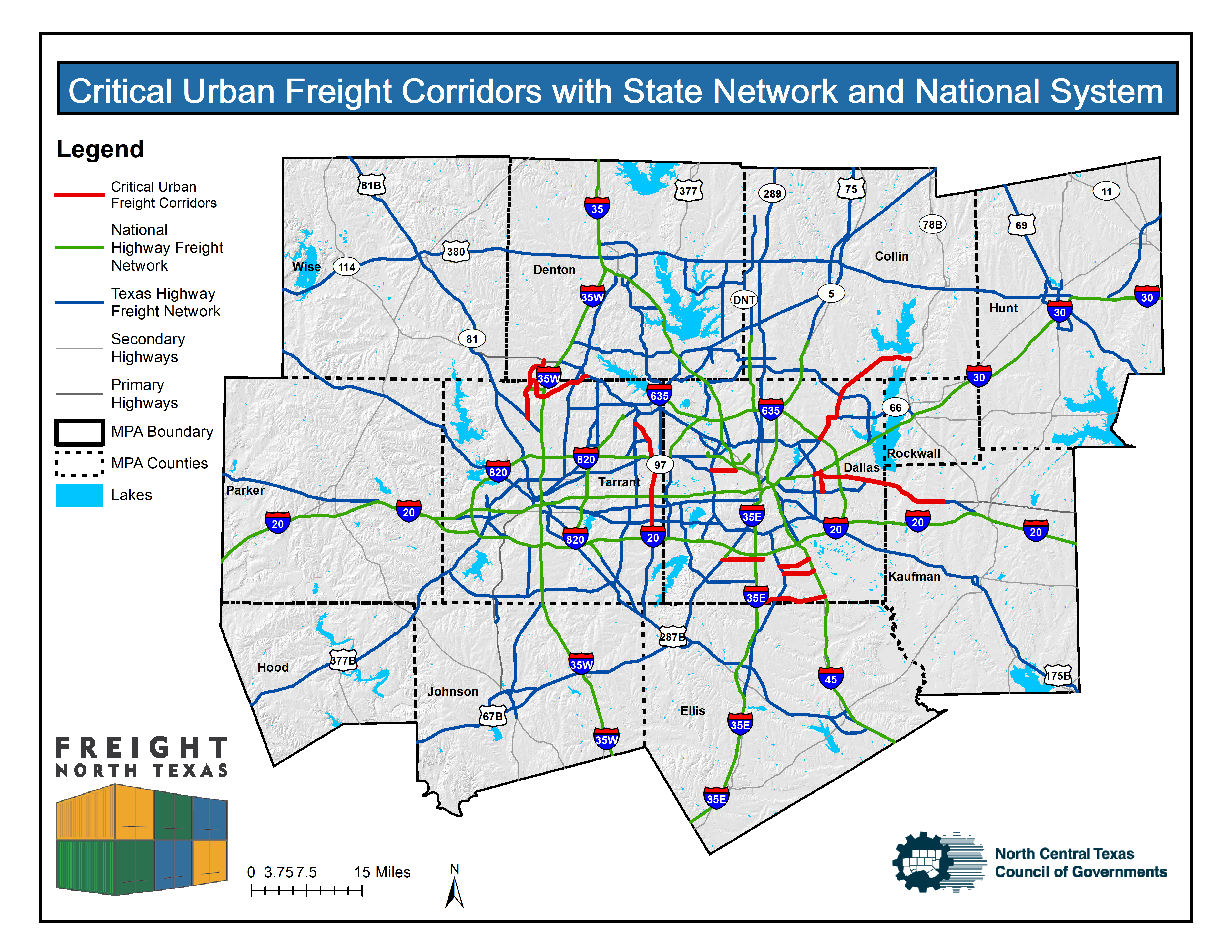 The North Central Texas Council of Governments participates in the Regional Critical Urban Freight Corridor system. The goal is to identify important freight corridors that provide critical connectivity to the state freight network and the Primary Highway Freight System. The regional Critical Freight Corridor system will align with The Metropolitan Transportation Plan, The Transportation Improvement Program, and the Ten Year Plan.