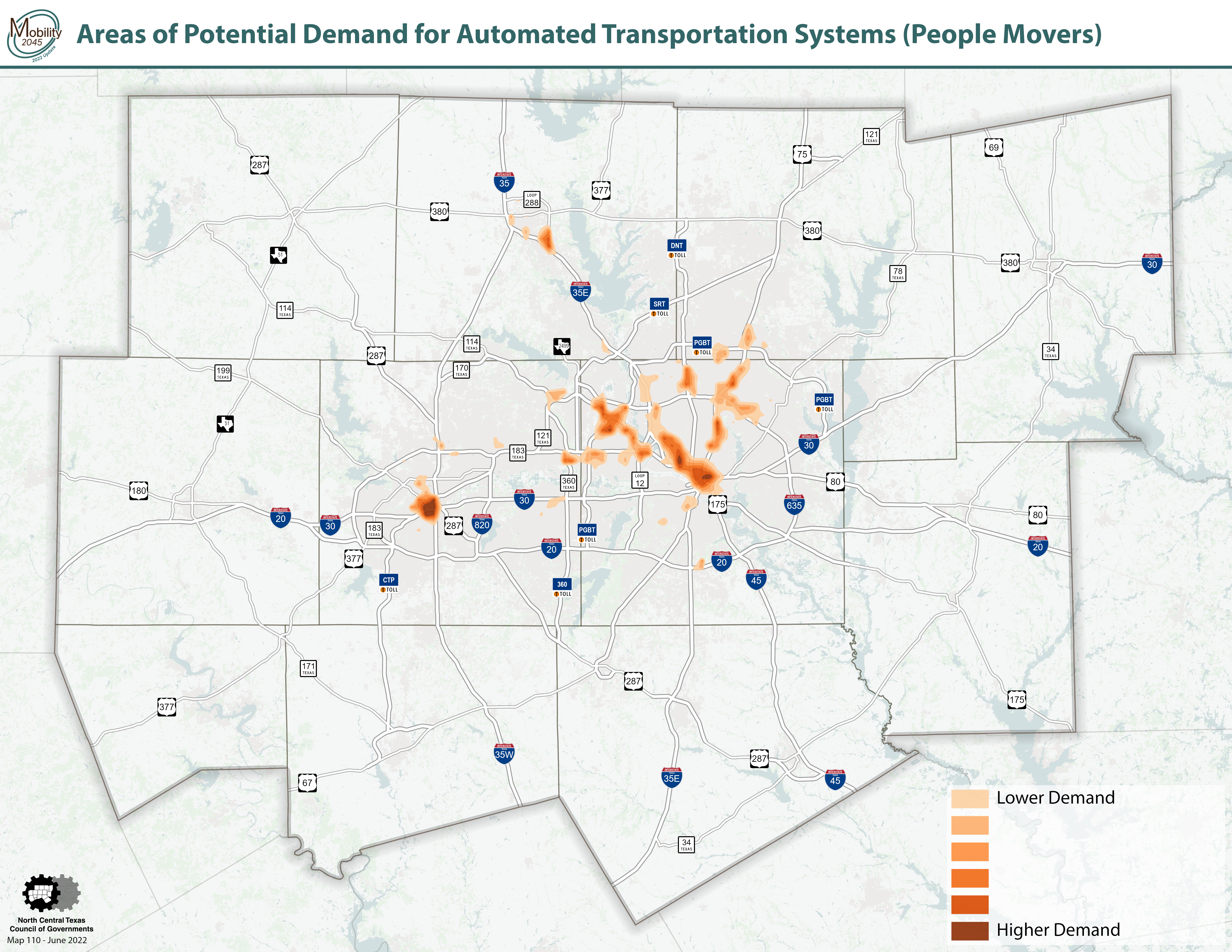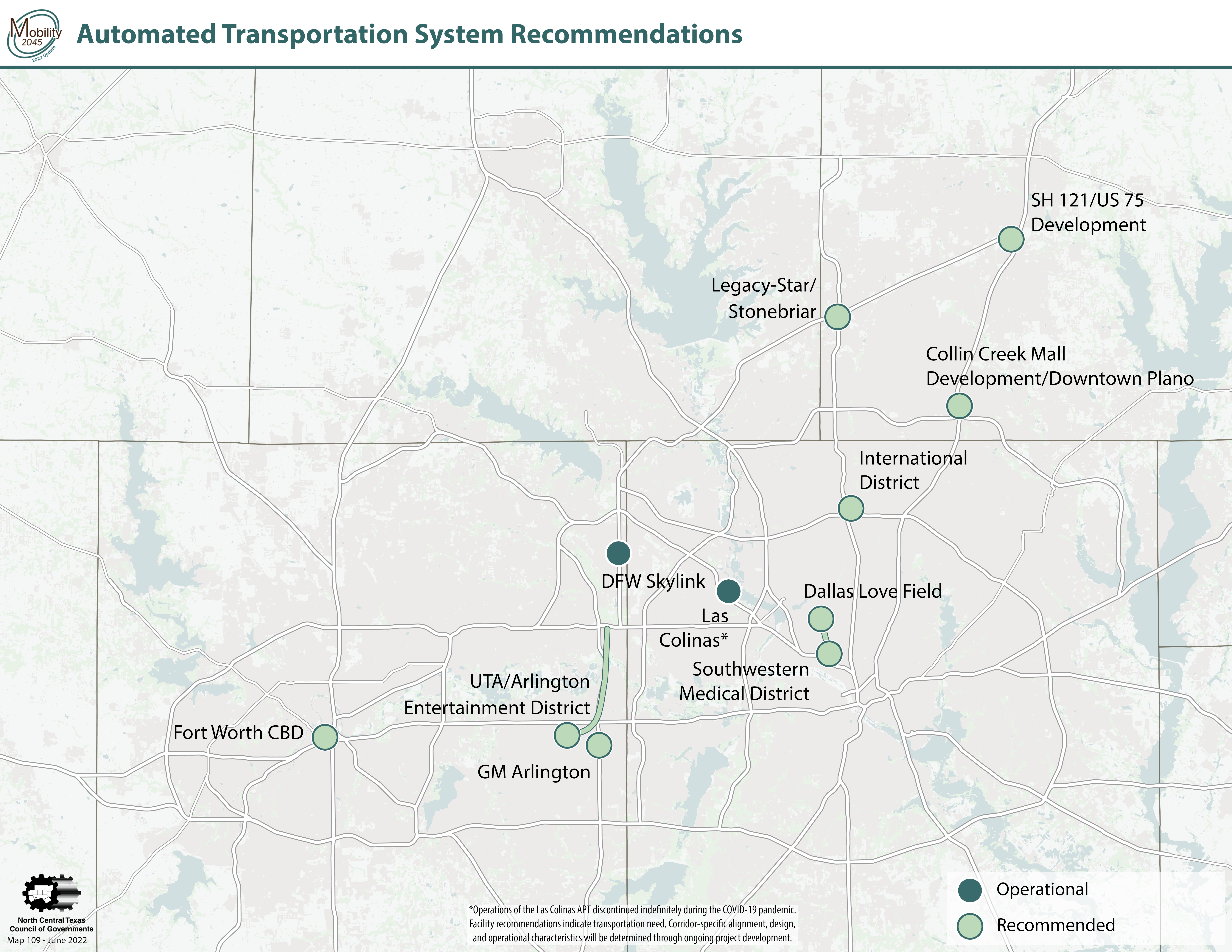NCTCOG determines the feasibility of ATS based on several factors. For the movement of passengers, we may consider existing and planned land uses, population counts, parking strategy, and connectivity, to the broader transportation network.