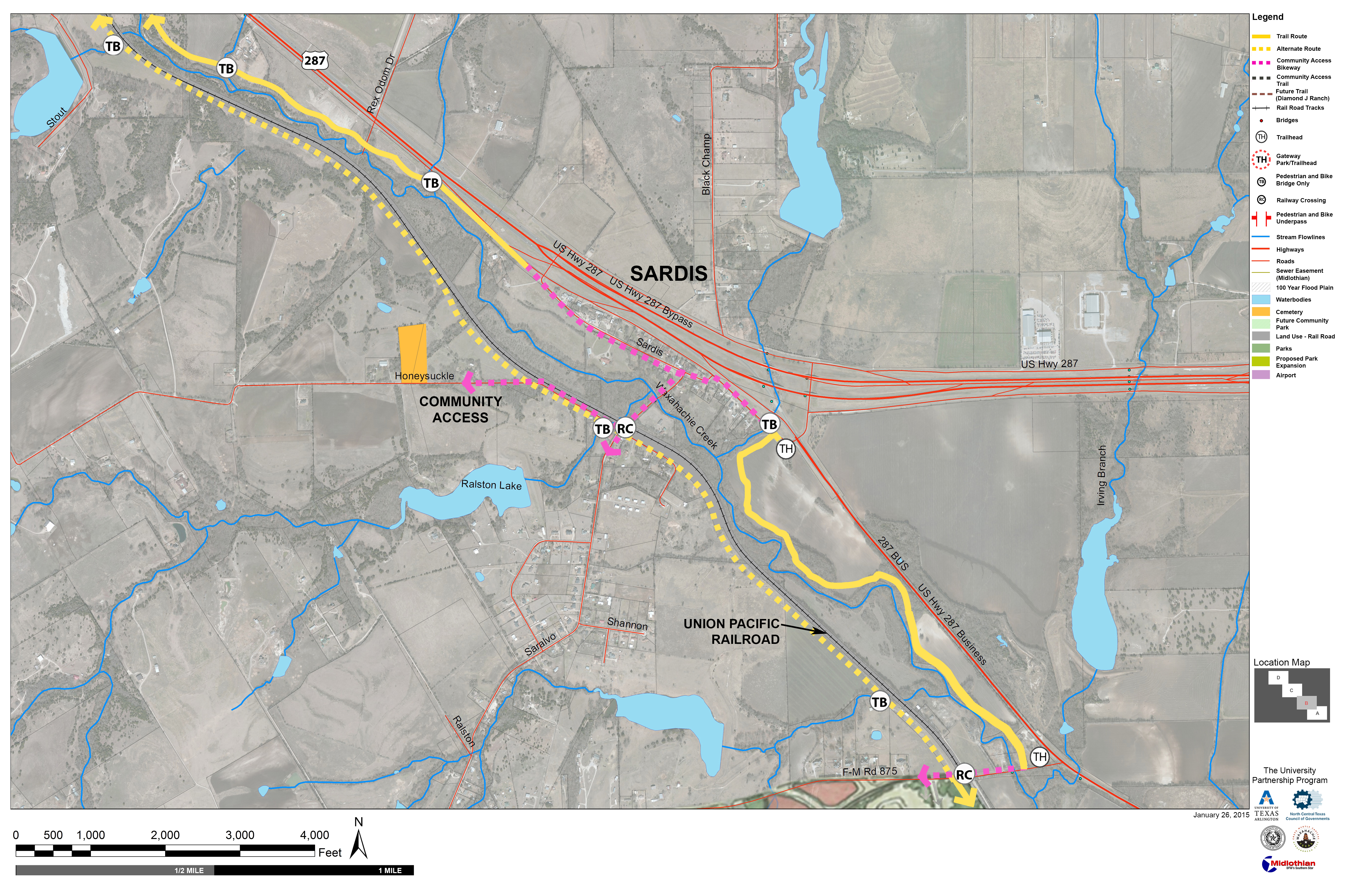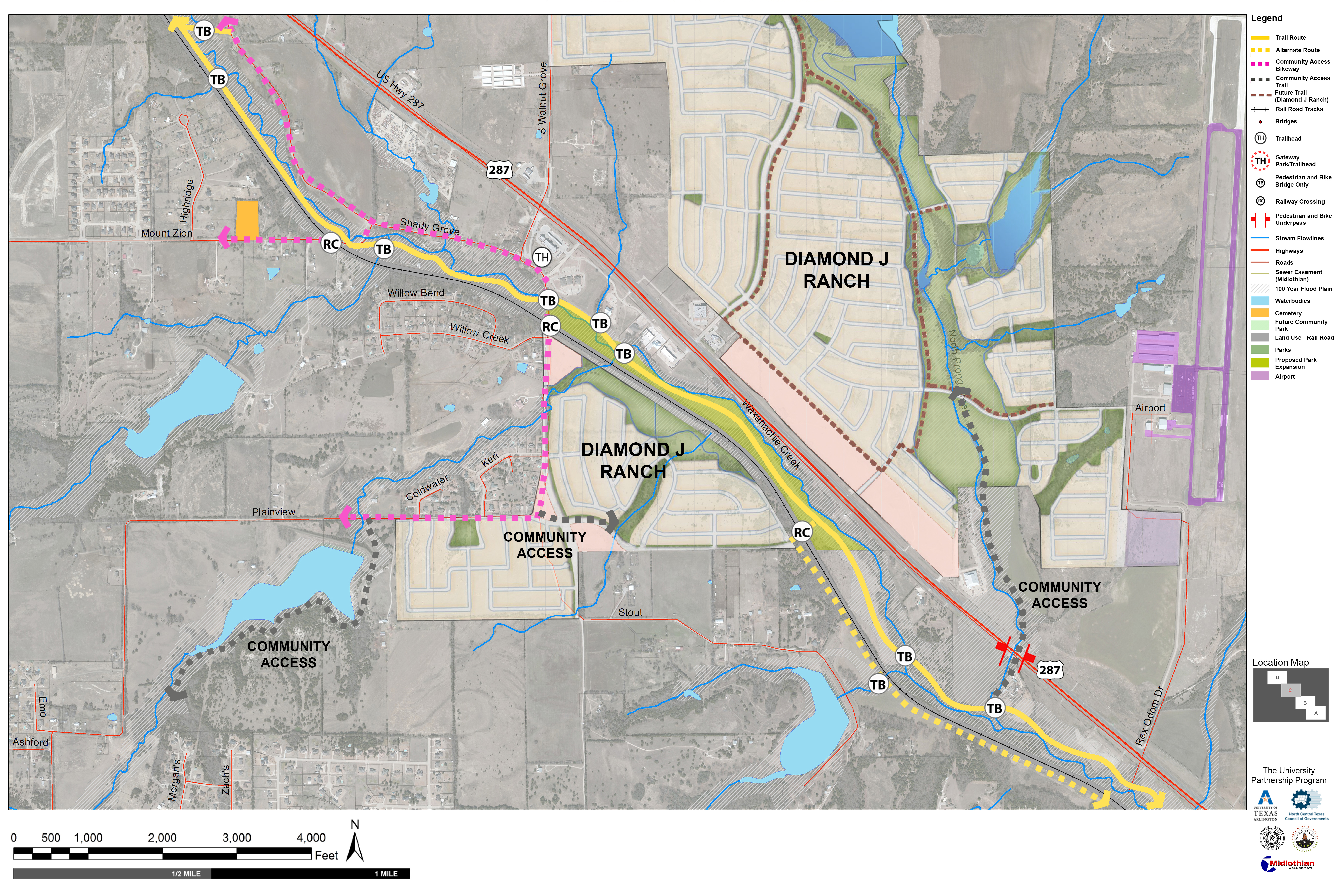 Project Description: NCTCOG, in partnership with the cities of Midlothian and Waxahachie, Ellis County, and the University of Texas at Arlington worked together to study alignment options and the feasibility of constructing an eleven mile regional shared-use path in Ellis County linking the cities of Midlothian and Waxahachie. The planned path will provide safe, alternative modes of transportation, improve air quality, spur economic development, encourage physical activity and promote connectivity between the two cities. Researchers examined existing natural and human features to generate alternative trail system routings. Potential spurs to nearby destinations were also explored.