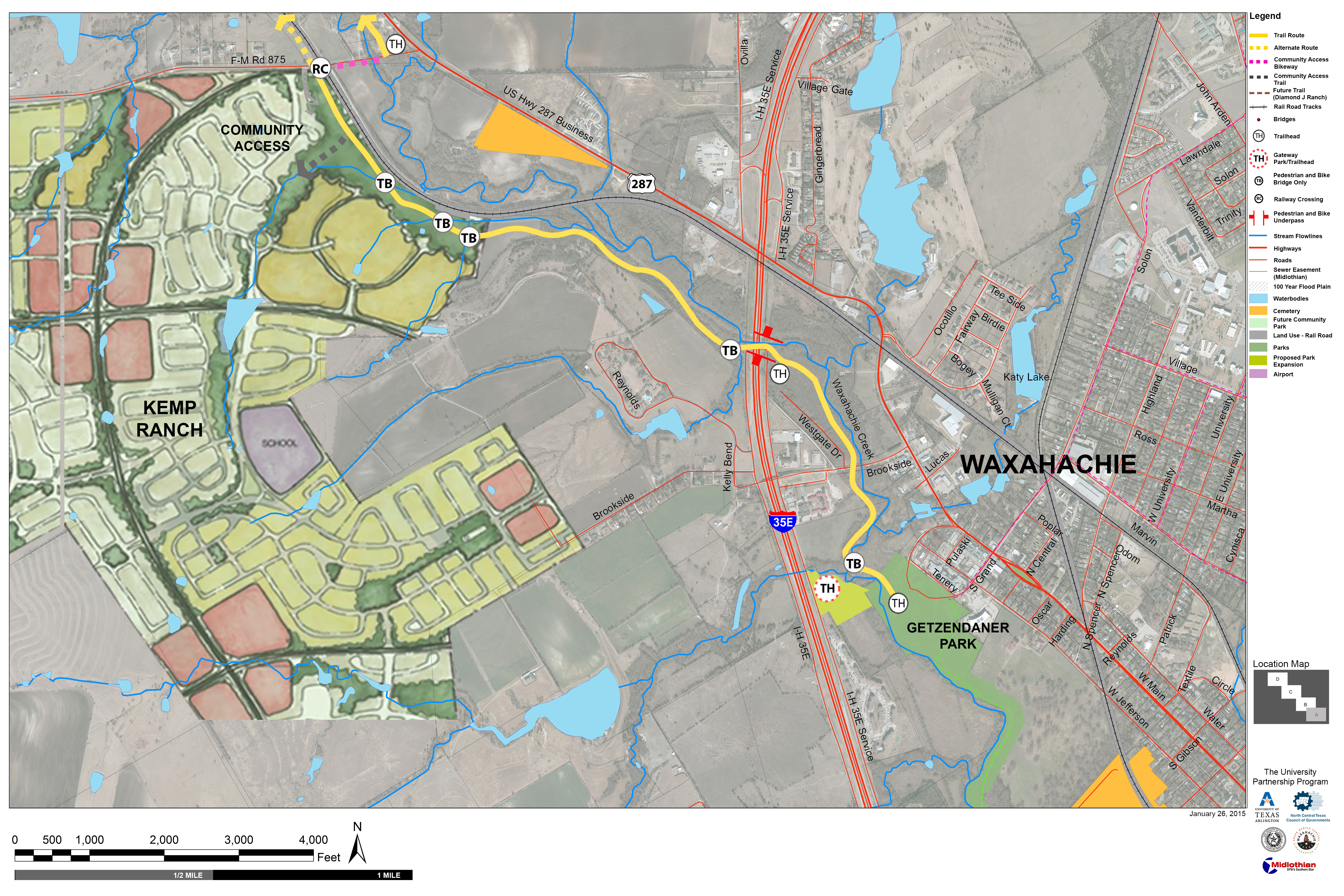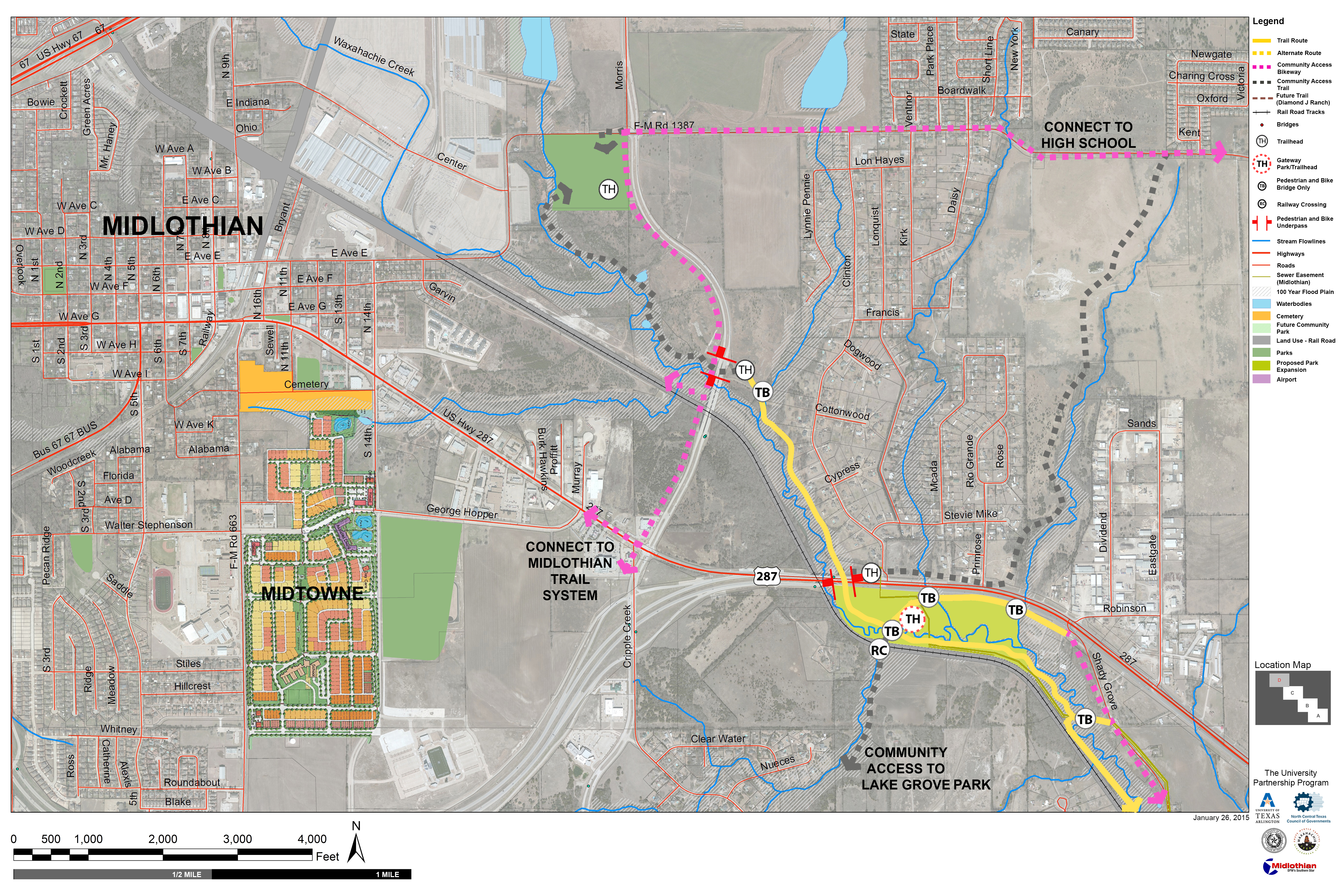 The final draft of the corridor for a proposed regional shared-use path that will connect the cities of Midlothian and Waxahachie is now available. The City of Waxahachie's Parks Board adopted the plan on March 5, 2015 and the City of Midlothian's Parks Board adopted the plan on April 13, 2015.