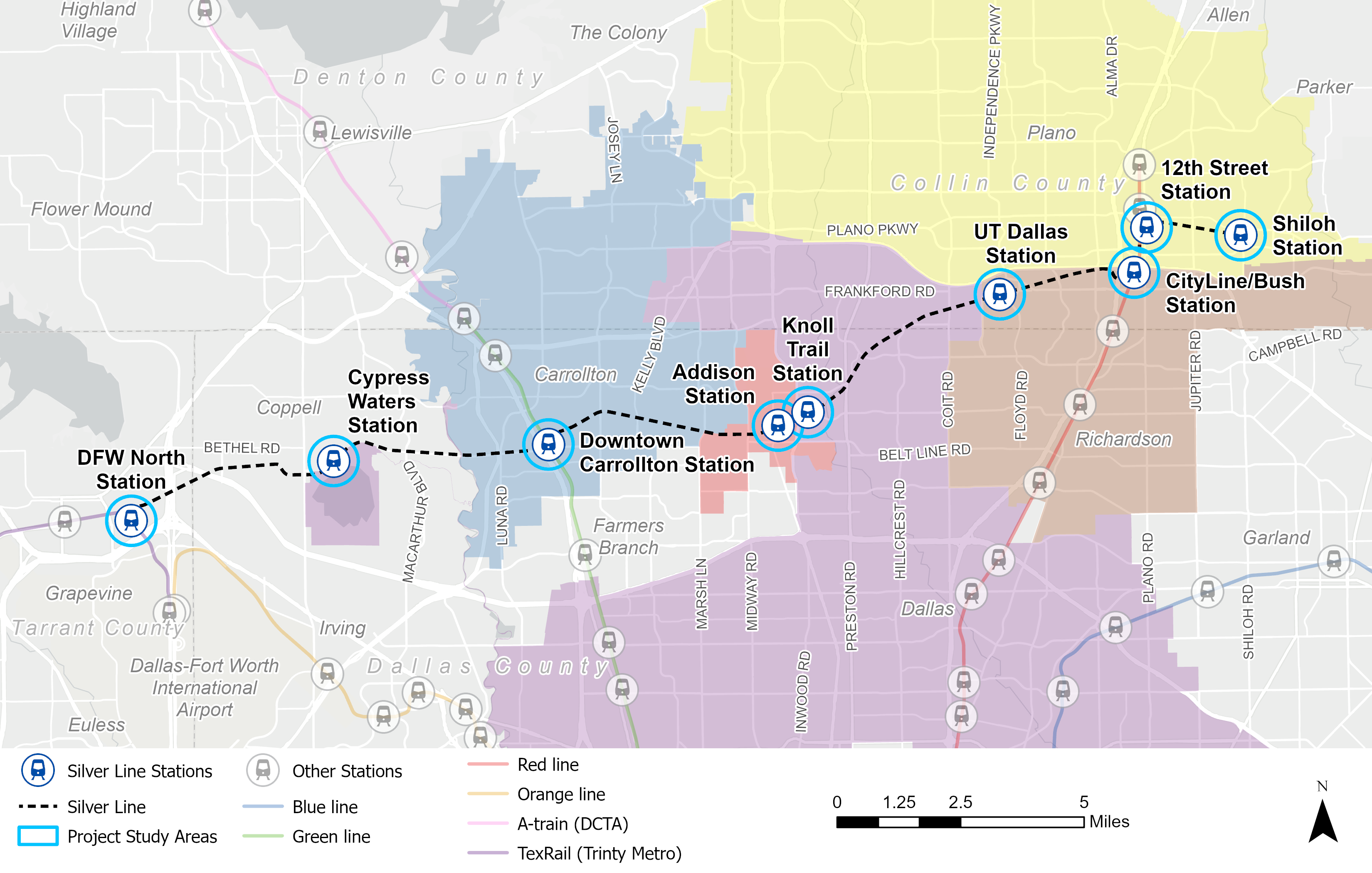 The Federal Transit Administration awarded NCTCOG a $1 million planning grant in 2021 to help the region advance TOD on the Silver Line regional rail corridor through the FTA TOD Planning Pilot Grant program. The goal is to increase Silver Line ridership through maximizing TOD opportunities and active transportation connections to stations within the corridor. NCTCOG coordinated with the Cities of Carrollton, Dallas, Plano, Richardson; the Town of Addison; DFW Airport; UT Dallas; DART and private sector partners along the corridor. Findings and overall recommendations are provided in the Silver Line Corridor TOD Plan document.