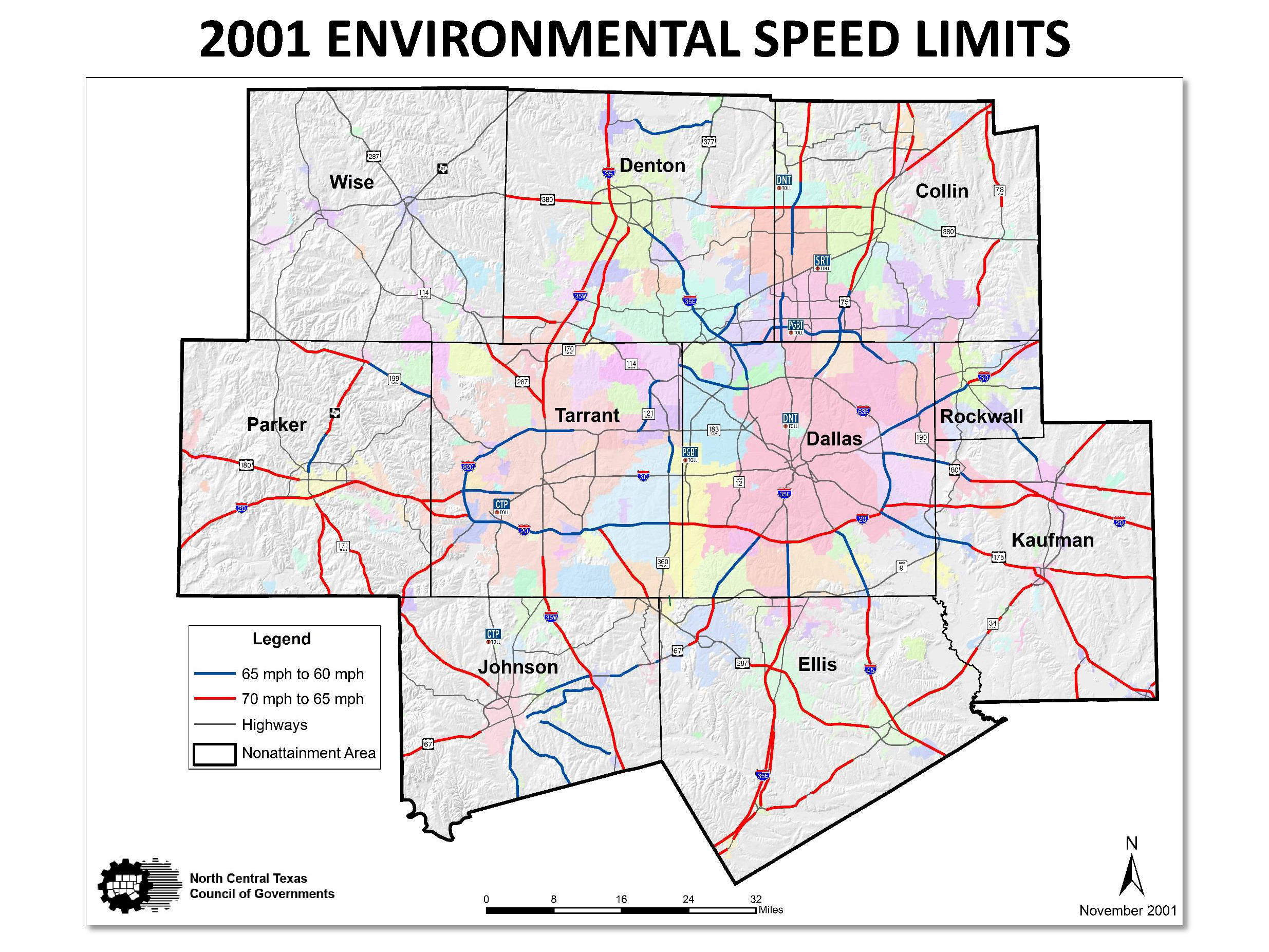 The Speed Limit Reduction Measure states, "Beginning September 1, 2001, speed limits on roadways with a current maximum speed limit of 70 mph will be reduced to 65 mph, while speed limits on roadways with a current maximum speed limit of 65 mph will be reduced to 60 mph." The Speed Limit Reduction Measure has been implemented in the Counties of Collin, Dallas, Denton, Ellis, Johnson, Kaufman, Parker, Rockwall and Tarrant.