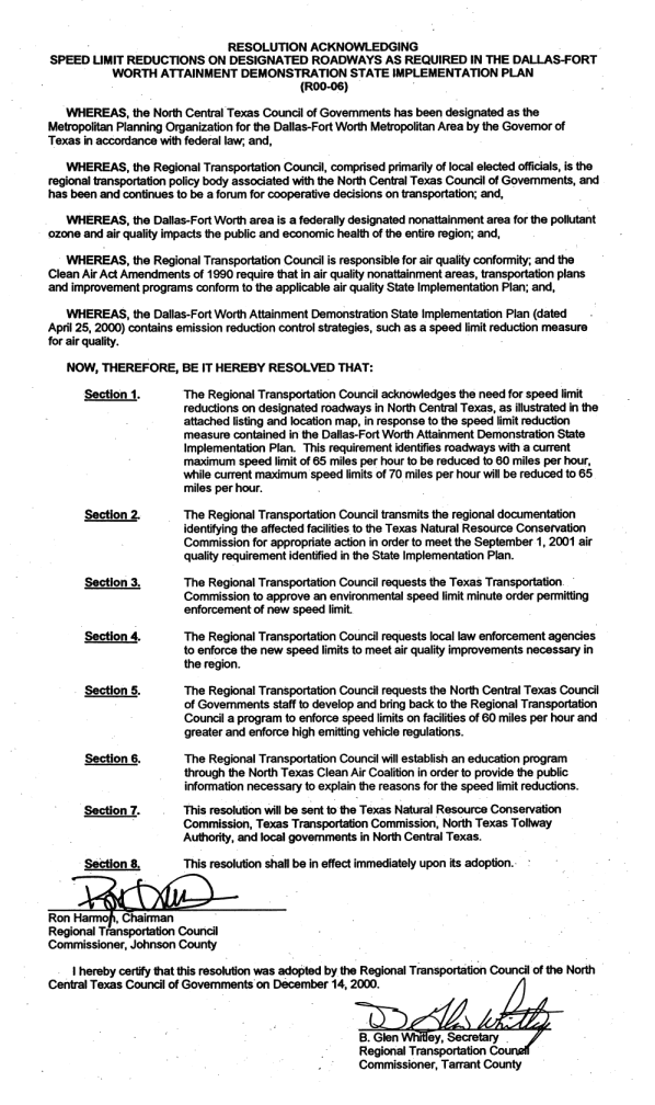 On April 28, 2000, the Texas Natural Resource Conservation Commission (TNRCC), the State of Texas' environmental agency, submitted the Dallas-Fort Worth (DFW) Attainment Demonstration State Implementation Plan (SIP) to the U.S. Environmental Protection Agency (EPA). The SIP contains several emission reduction control strategies to improve air quality in the region to reach attainment by November 15, 2007. One of those control strategies is the Speed Limit Reduction Measure, adopted by the RTC on December 14, 2000.
