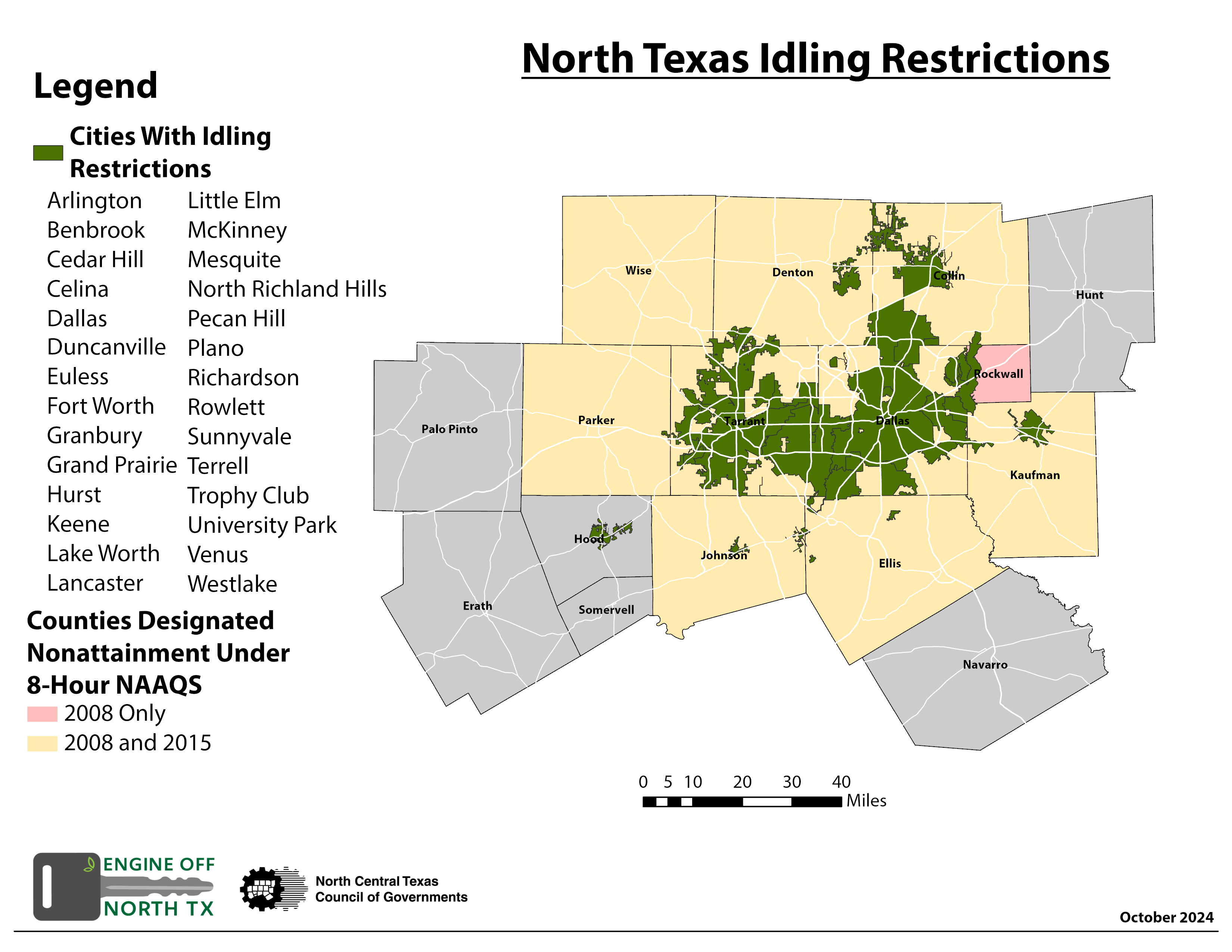 Several cities and counties within the ten-county ozone nonattainment area have adopted idling regulations. Most ordinances are similar to the Texas Commission on Environmental Quality’s (TCEQ) Idling Limitation Rule and are enforced locally. Below is a map of the North Central Texas cities and counties where idling restrictions are being enforced.
