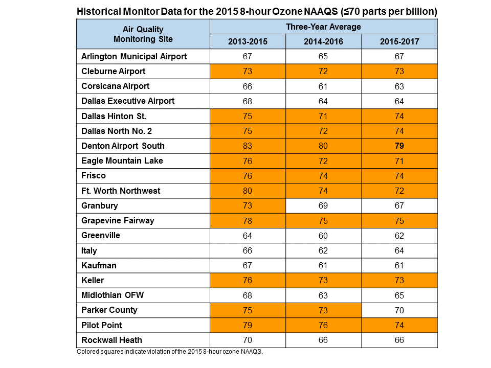 On October 26, 2015, EPA revised the 8-hour ozone NAAQS from 75 ppb to 70 ppb, effective December 28, 2015. The final rule also extends the ozone season for the NCT region by one month to November 30th. EPA signed the final rule classifying nine counties (Collin, Dallas, Denton, Ellis, Johnson, Kaufman, Parker, Tarrant and Wise as marginal nonattainment. Once the final rule is published in the Federal Register , the effective date will be 60 days from publication. A marginal nonattainment classification gives the region three years to achieve attainment.