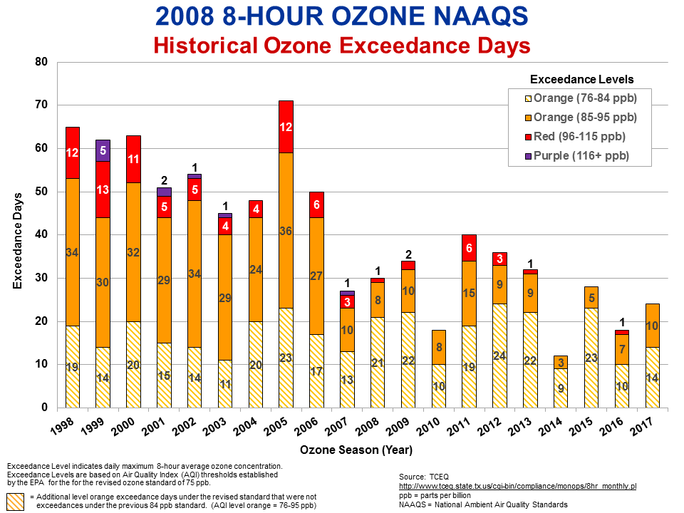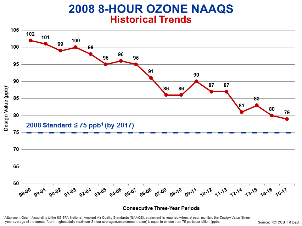 The Environmental Protection Agency (EPA) is required to set National Ambient Air Quality Standards (NAAQS) for harmful pollutants, per the Clean Air Act Amendments of 1990. Every five years the EPA is required to reevaluate the NAAQS to ensure adequate protection of human health and the environment, based on the best available science. The information below describes the historical and current information about the 8-hour ozone standard in the North Central Texas (NCT) region.