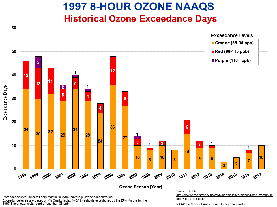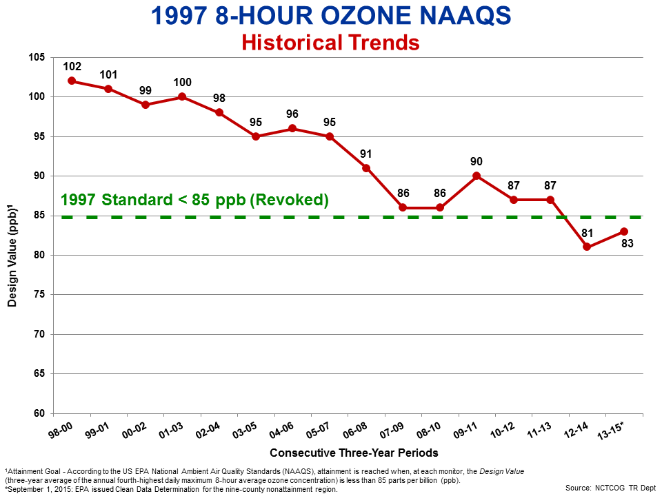 On June 15, 2004, nine counties in the NCT region were designated as moderate nonattainment for the 1997 ozone NAAQS. Those counties are Collin, Dallas, Denton, Ellis, Johnson, Kaufman, Parker, Rockwall and Tarrant. The NCT region's deadline to demonstrate attainment for this standard was June 15, 2010. Although the region's design value and the number of ozone exceedance days are steadily decreasing, the region failed to meet the 2010 attainment deadline, and was reclassified under the 1997 ozone NAAQS as serious nonattainment in December 2010, with an attainment date of June 15, 2013. The NCT region failed to meet the 2013 attainment deadline; however, the region did meet the 1997 ozone NAAQS in 2014 with a design value of 81 ppb.