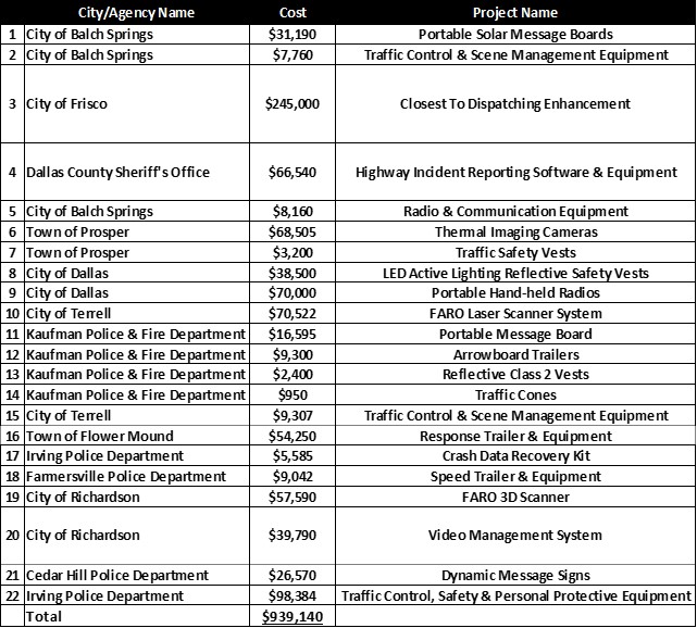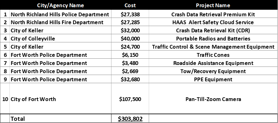 Types of equipment eligible for funding included but was not limited to: cones, protective clothing, traffic barriers, signs, cameras, flares, barrels, lighting, radio equipment, accident reconstruction equipment/ technology, etc. Agencies selected to receive funding are responsible for purchasing the desired equipment and seeking reimbursement from NCTCOG.